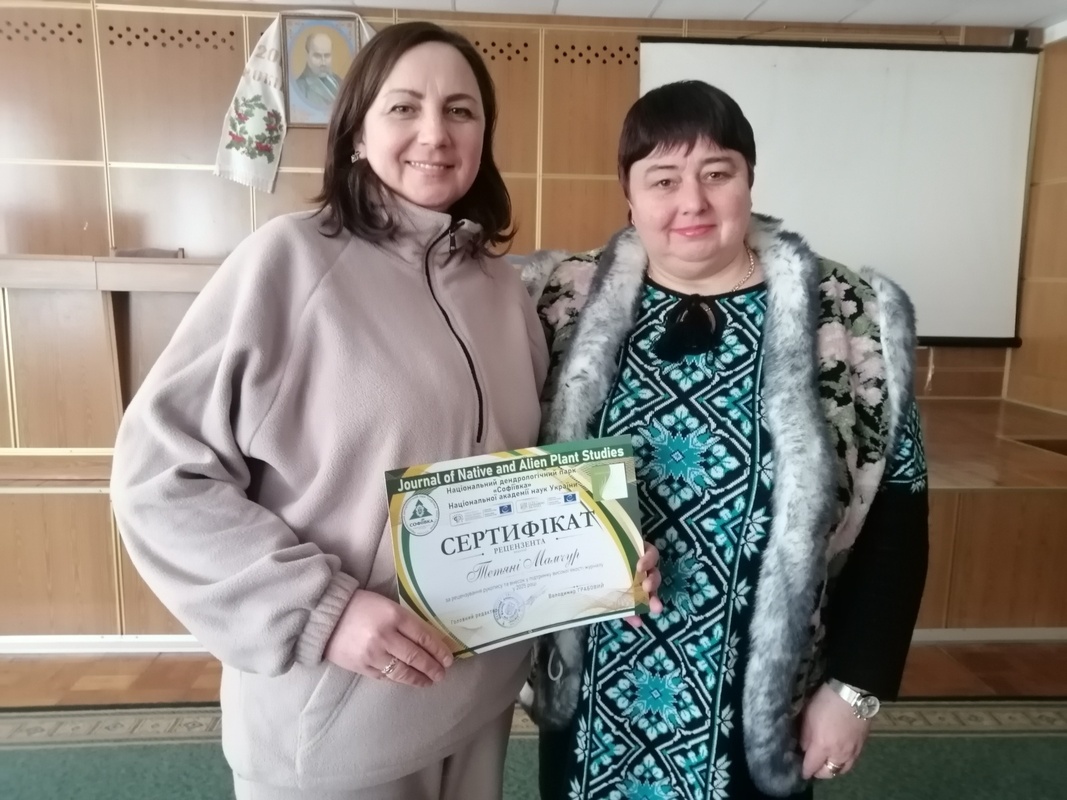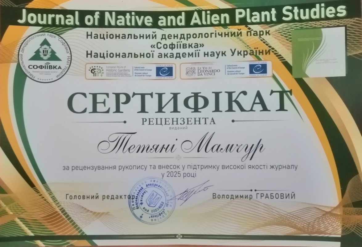 Користуючись нагодою заступник директора, доктор біологічних наук Любов ІЩУК вручила Тетяні МАМЧУР сертифікат рецензента, який виданий за рецензування рукопису та внесок у підтримку високої якості журналу «Jurnal of Native and Alien Plant Studies» у 2025 році.