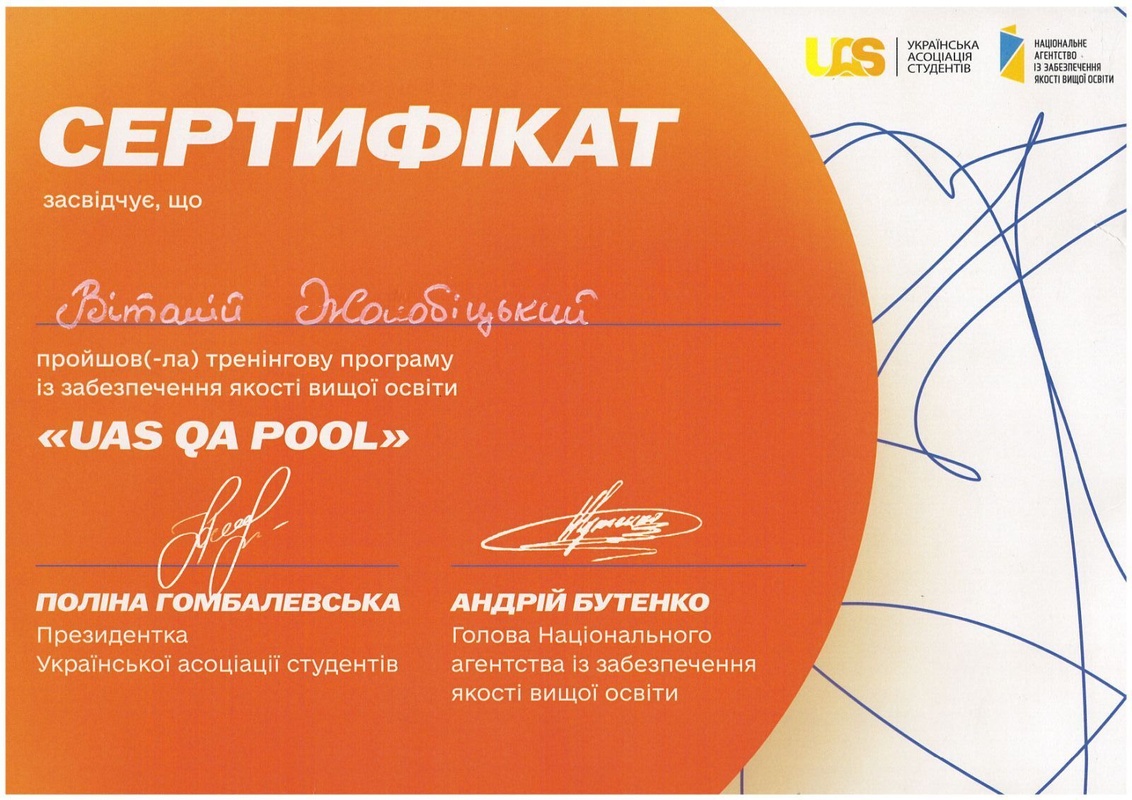 Віталій ЖОЛОБІЦЬКИЙ, студент 11 б групи, успішно пройшов навчання для студентських експертів з якості вищої освіти, організоване Громадською організацією «Українська асоціація студентів» і відбулося з 3 по 5 квітня 2026 року в м. Кропивницький.