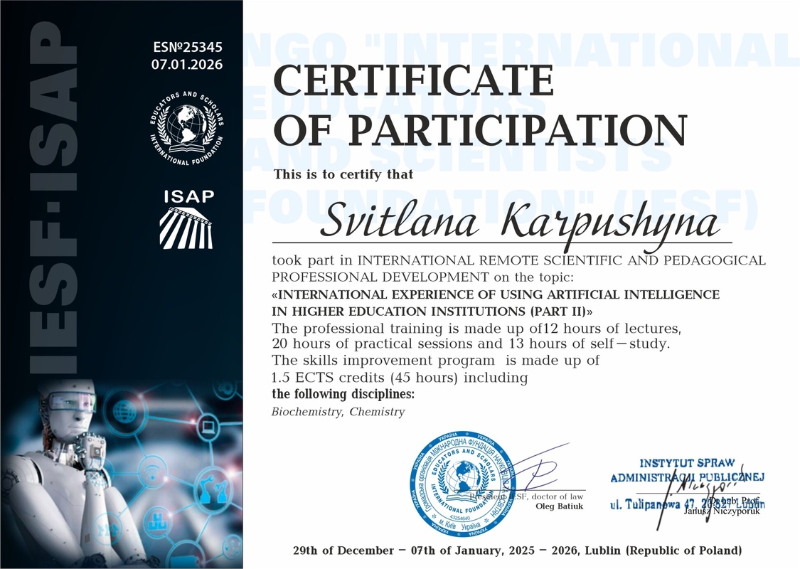 Доцент кафедри Карпушина С. А. пройшла міжнародне дистанційне науково-педагогічне підвищення кваліфікації на тему: «Міжнародний досвід використання штучного інтелекту в закладах вищої освіти» Організатори: Інститут справ адміністрації публічної ISAP (м. Люблін, Республіка Польща) та Міжнародна фундація науковців та освітян – IESF. Термін: 29 грудня 2025 року по 07 січня 2026 року включно. Навчальне навантаження становить 1,5 кредитів ЄКТС (45 годин).