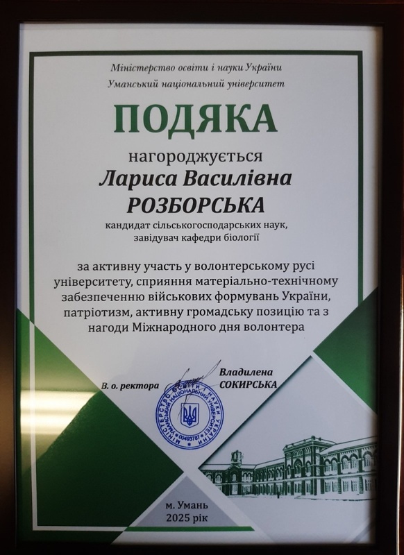 З нагоди Міжнародного дня волонтера в Уманському національному університеті були відзначені найактивніші представники цього руху. Серед них Лариса РОЗБОРСЬКА, кандидат сільськогосподарських наук, завідувач кафедри біології. Подяку за активну громадянську позицію, сприяння матеріально-технічному забезпеченню військових формувань України і патріотизм вручила виконувачка обов’язків ректора УНУ Владилена СОКИРСЬКА.